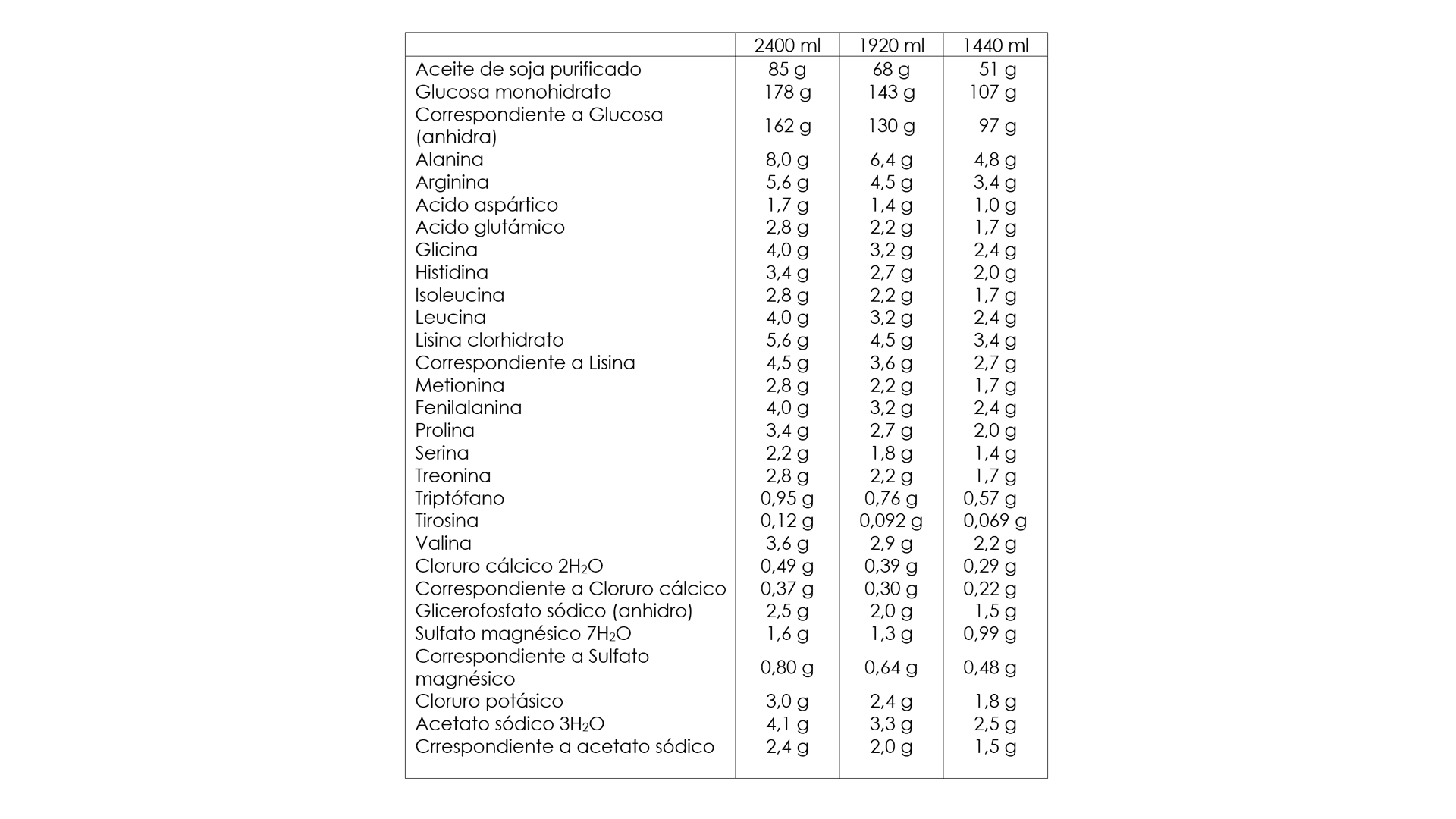 Kabiven Periferico está disponible en un sistema de bolsa de tres cámaras. Cada bolsa contiene los siguientes diferentes volúmenes dependiendo de los cuatro tamaños de envase: